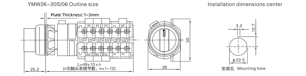 20A enkelhåls mittmonterade kamomkopplare (intern modell: YMW26-20S) är en högpresterande elektrisk kontrollkomponent som utvecklats oberoende av YAMING, en erfaren tillverkare med 30 års erfarenhet inom industrin för elektriska omkopplare. Designad för AC 50Hz (upp till 690V) och DC 240V (märkström upp till 20A) kretsar, denna switch har kompakt struktur, pålitlig prestanda och utmärkt anpassningsförmåga.