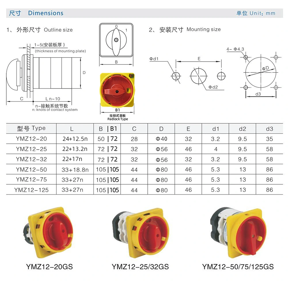 Detta 75A hänglås AV-PÅ tvåläges kombinationsroterande kamomkopplare (intern modell: YMZ12-75GS) är designat för 50 Hz AC elektriska system, med en märkspänning på upp till 690V AC / 240V DC och en märkström på 75A.